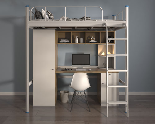 上圖就是一個新式的雙層鐵床圖片,你確定你用過嗎,我想,大部分人就沒有見過這樣的設計圖,雖然,上邊是床,下邊是桌柜,但它的制作金屬材質比較好,有的是鐵柜,有的是木柜,可根據自身喜歡選擇不同材質的家具布置在下鋪。