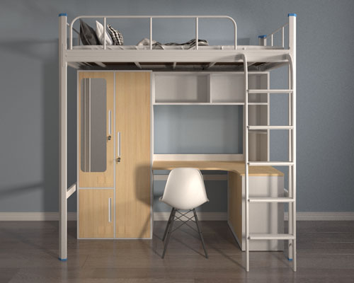 上圖三中的雙層鐵床圖片,與上邊兩種都是相同的,只不過它的下鋪的家具都有所變化,從雙開門的柜子,到上下開門的柜子,不僅可以放衣物,還可以放鞋子,還可以在這里坐坐,看看書,聊聊天,在我們工作之外的時間里,還可以有著自己的休閑時光。