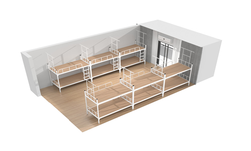 上圖二中所示,就是一個帶有蚊帳架的雙層鐵床的宿舍,看上去放有六張雙層鐵床,也有可能是兩張三連體的雙層鐵床,這樣更不會占用什么空間了,并且牢固性好,從而使一個小宿舍可以容納十二人,這樣的宿舍可能一些工廠都比較適用一些。